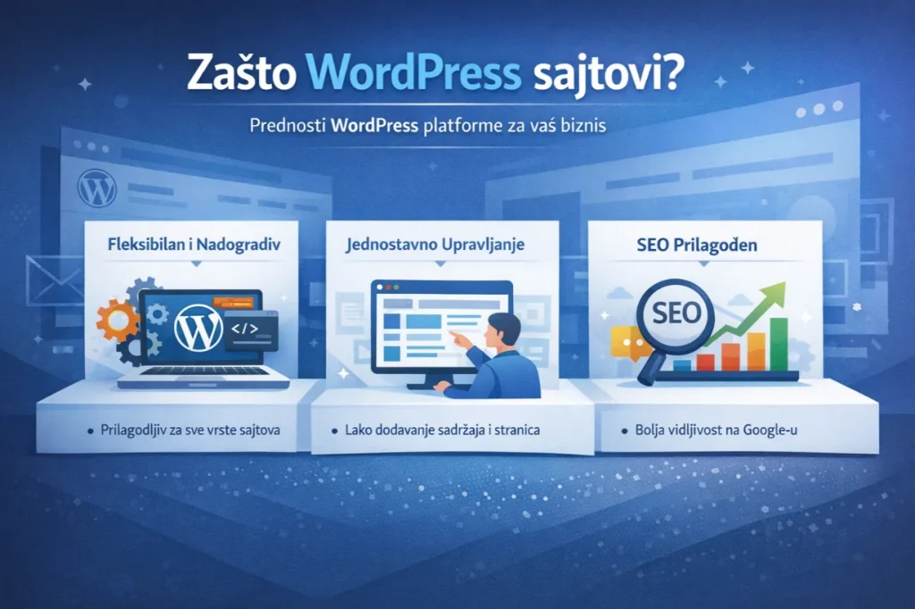 WordPress je open-source i lako se prilagođava raznim potrebama: od prezentacionih sajtova i portfolija, do kompleksnijih poslovnih sajtova. Funkcionalnosti se proširuju pomoću dodataka (pluginova), bez skupog razvoja “od nule”.